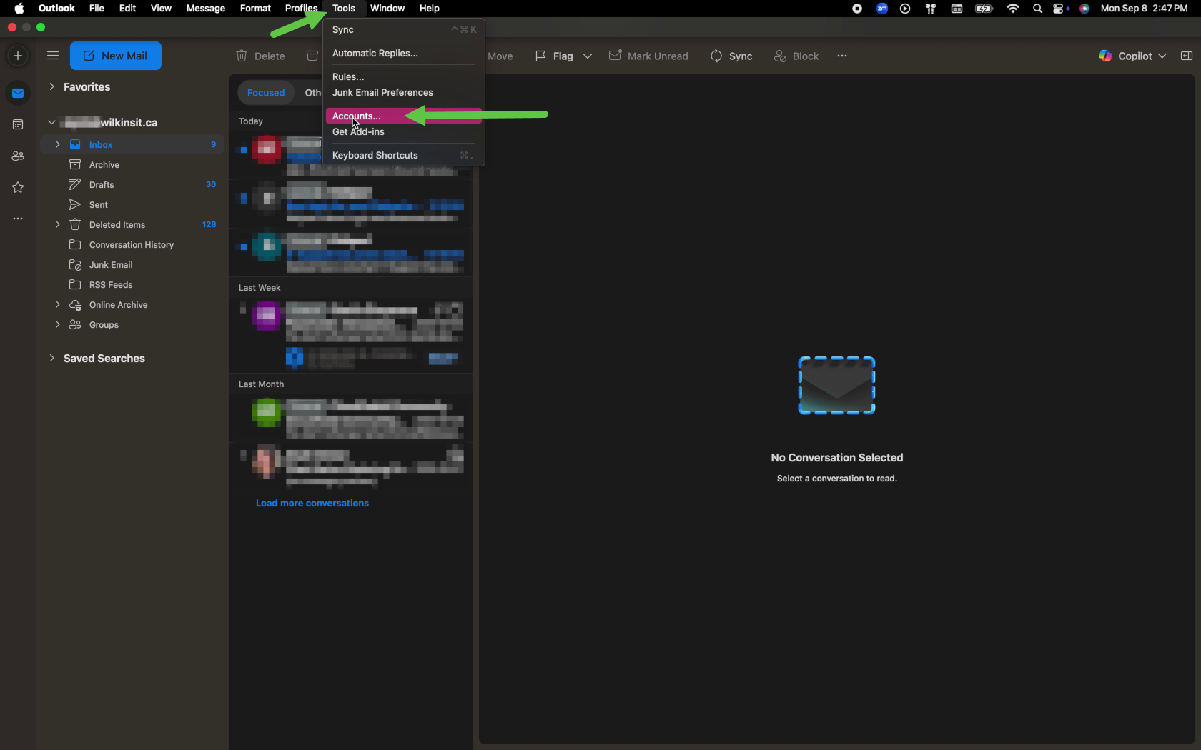 - With Outlook active, navigate to the menu bar and click Tools > Accounts…