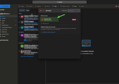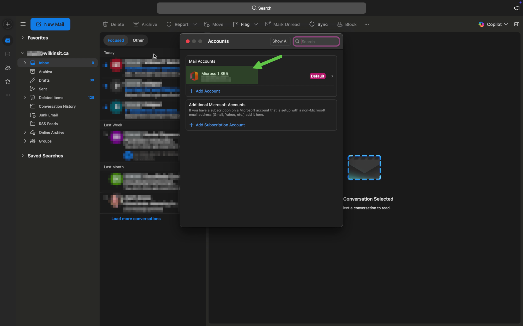 - In the Accounts window that appears, click on your existing Office 365 account underneath Mail Accounts